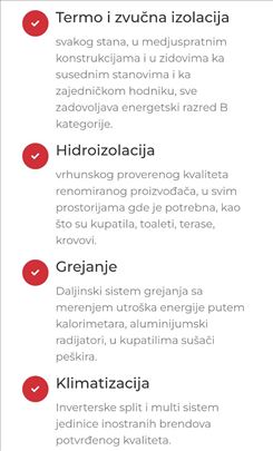 Stan cetvorosobne strukture sastoji se od ulaznog hodnika dnevnog boravka open space sa trpezarijom i kuhinjom, TRI spavace sobe, DVA kupatila, DVE terase, garderober, centralno grejanje sa kalorimetrima, inverter klime